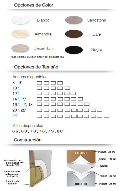 Placas de acero galvanizado Calibre 20 en la orilla de cada sección facilita la instalación de bisagras, refuerzos, manijas y otros accesorios.