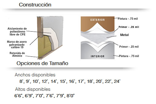 Placas de acero galvanizado Calibre 20 en la orilla de cada sección facilita la instalación de bisagras, refuerzos, manijas y otros accesorios.